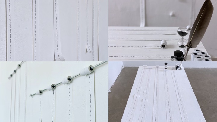 “Inhale, Exhale” installation. Ink on thermal paper rolls (10 meters each), metal quill pen, Indian ink, hourglass. Vienna, 2022.