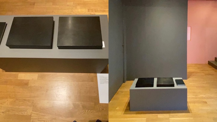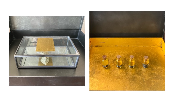 Assisted olfactory installation. Two iron boxes, one glass box with a mirror, pure gold leaves 24 Karat, four perfume oil bottles, Pyrite stone (fool's gold), golden trickster card. Vienna, 2022.